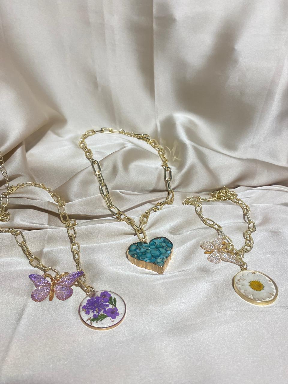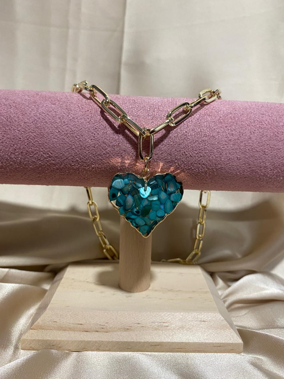 El collar Corazón Turquesa es una pieza radiante que combina la elegancia del baño en rodio con la belleza natural de las piedras turquesas incrustadas en su dije en forma de corazón. Cada fragmento crea un efecto luminoso y artesanal que resalta por su color vibrante y energía especial.